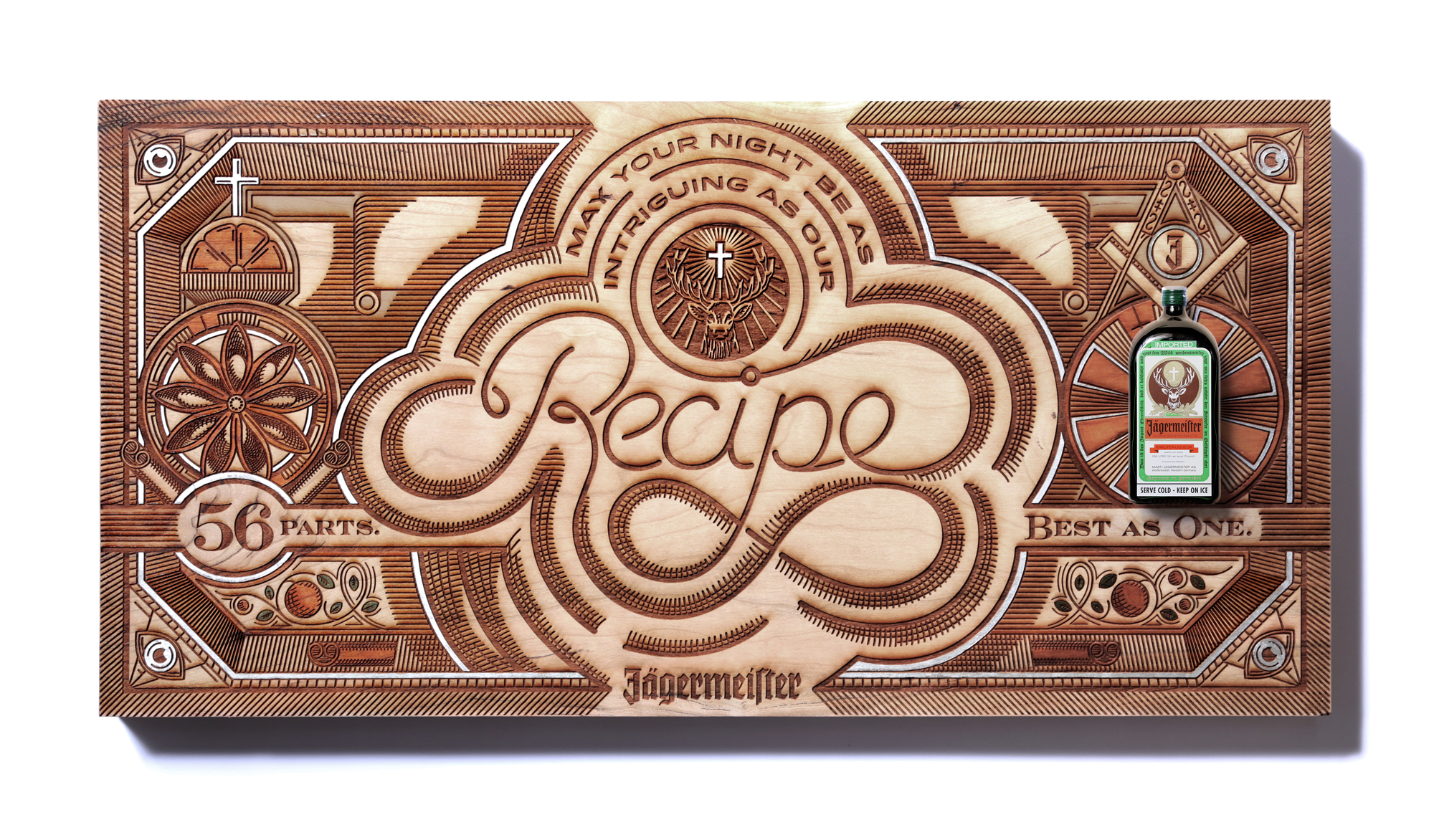 This laser-cut wood social post for Jagermeister features a piece of hand-lettering at the center, surrounded by imagery that references Jagermeister's ingredients, as well as an effort to create "intrigue" in reference to the headline, with the use of templar and illuminati symbology.